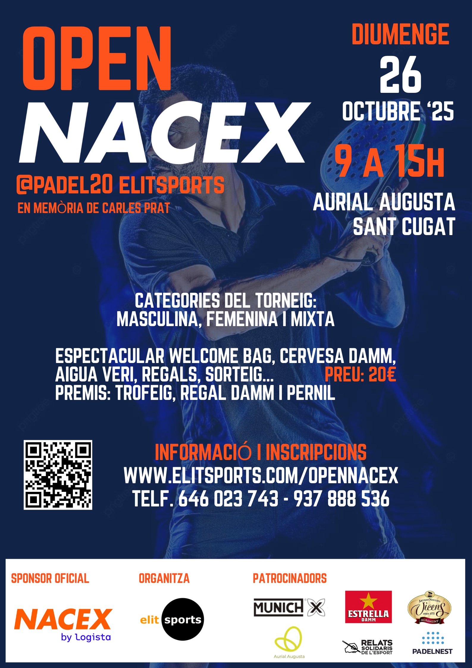 Els tornejos open Nacex @padel20 són un clàssic dins del pàdel amateur a Catalunya. Des del 2011 a la Penya Arlequinada de Castellar del Vallès fins a dia d’avui hem passat per Stars Padel Cornellà, Aurial Padel Sant Cugat, BPI Barberà, Terrassa Club de Padel, Padel Indoor Granollers, Air Club Padel Barberà, Aurial Indoor Padel Sabadell…